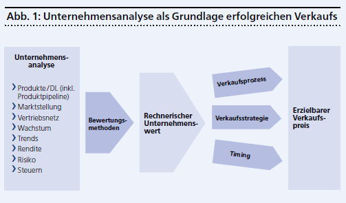 Im Rahmen eines Übergabeprozesses bilden die Unternehmensanalyse und -bewertung eine entscheidende Grundlage (siehe Abb. 1). Die Grafik verdeutlicht jedoch auch, dass ein rechnerisch eruierter Unternehmenswert nicht zwingend dem erzielbaren Verkaufspreis entspricht. Weitere Faktoren wie Verkaufsstrategie, Konjunkturlage, Branchentrends und ähnliche Elemente prägen den Verkaufsabschluss zusätzlich und werden bei Bewertungen oftmals ungenügend berücksichtigt.