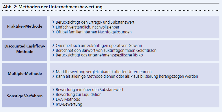 Es können statisch, vergangenheitsorientierte Verfahren wie die Mittelwert- oder Praktikermethode sowie zukunftsorientierte, dynamische Instrumente wie die DCF-Methode angewendet werden. Die sogenannte Multiple-Methode, die den Wert vergleichbarer Gesellschaften heranzieht und einen Multiplikator ableitet, runden die mehrheitlich in der Praxis angewendeten Verfahren ab.