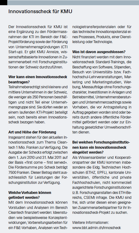 Erfreulich ist, dass die Finanzierung der Innovationsförderung durchschnittlich um mehr als sechs Prozent pro Jahr gestiegen ist. Im Vergleich zum asiatischen Raum ist der reale Zuwachs für die Forschungsförderung in der Schweiz allerdings bescheiden. Erstaunlicherweise hatte die KTI noch nie so viele Gesuche wie im Krisenjahr 2009. Speziell das neue Förderinstrument Innovationsscheck hilft, KMU als Neukunden der KTI zu erreichen. Vermehrt gibt es auch Verbundprojekte mit dem SNF, was zu einem weiteren Ansteigen der Nachfrage in der angewandten Forschung führt. Die Rekordzahl an Gesuchen steht für den hohen Innovationswillen der Schweizer Wirtschaft in wirtschaftlich schwierigen Zeiten und die Erkenntnis, dass Innovationen helfen, die Industrie im Wettbewerb nachhaltig weiterzubringen.