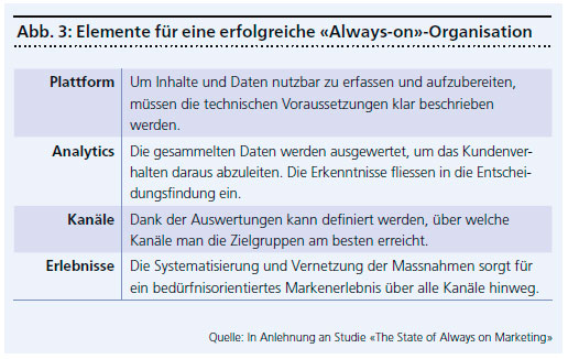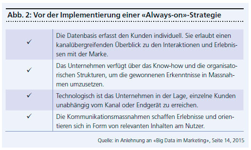 Um die festgefahrenen Abläufe im Kampagnen-Management zu durchbrechen, bietet «Always on» als Strategie eine zeitgemässe Alternative. Frei übersetzt könnte man von «Dauerbetrieb» sprechen: Nur wer in Echtzeit kontextabhängige Erlebnisse über diverse Kanäle und Endgeräte bereitstellt, erreicht den Konsumenten. Ein solcher Dauerbetrieb wäre natürlich nicht effizient sprich finanzierbar. Darum kommt bei «Always on» eine datengetriebene Komponente hinzu. Vereinfacht gesagt, dank Konsumentendaten kann unmittelbar und personalisiert auf die digitalen Interaktionen der Verbraucher reagiert werden.