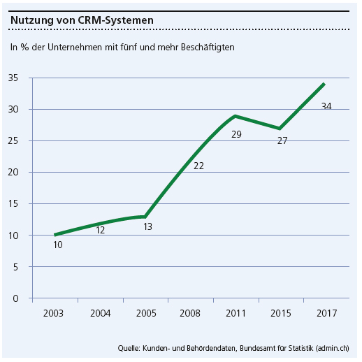 Das Bundesamt für Statistik (BFS) definiert ein CRM-Tool als ein System, mit dem die Kundeninformationen gesammelt, gespeichert, analysiert und verwaltet werden. Die vom Bundesamt für Statistik herausgegebene Grafik von 2019 zur Nutzung von CRM-Systemen in der Schweiz zeigt eine klare Tendenz des steigenden Einsatzes von CRM-Lösungen in Unternehmen. Allerdings hatten im Jahr 2017 noch immer nur ein Drittel der KMU und Grosskonzerne eine Kundenmanagement-Software im Einsatz.