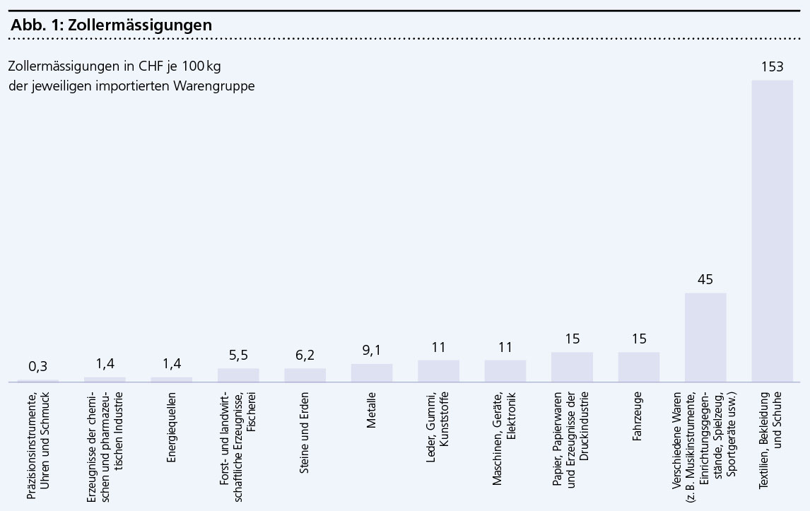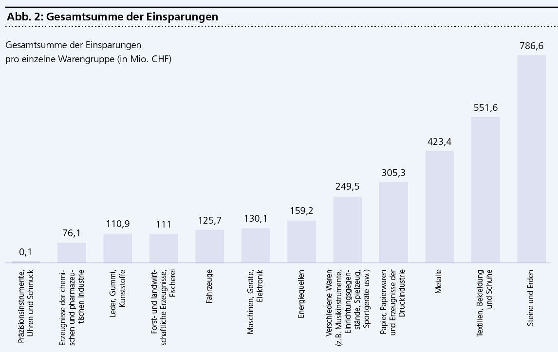 Die grösste Kostenreduktion in Franken pro 100 kg importierte Ware ist bei der Gruppe «Textilien, Bekleidung und Schuhe» festzustellen, gefolgt von der Gruppe «Verschiedene Waren» (zum Beispiel Musikinstrumente, Einrichtungsgegenstände, Spielzeug, Sportgeräte). Die Gruppe mit der kleinsten Kostenreduktion ist «Präzisionsinstrumente, Uhren und Schmuck» (siehe Abbildung 1).