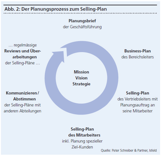Ein solches Vorgehen motiviert die Verkäufer nicht. Dabei wäre dies gerade, wenn sich die strategischen Zielvorgaben beispielsweise aufgrund veränderter Rahmendaten andern, extrem wichtig. Zudem werden so die Aktivitäten der beteiligten Bereiche wie Vertrieb, Marketing, Produktion und Service nicht verzahnt, weil vom federführenden Vertrieb kein Ziele- und Massnahmenplan (Selling-Plan) erstellt und dieser den anderen Bereichen kommuniziert wird.