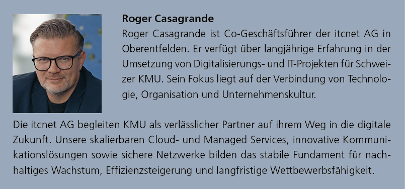 Roger Casagrande, Co-Geschäftsführer der itcnet AG in Oberentfelden, betont die Bedeutung einer ehrlichen Standortbestimmung: «Die Einführung modernster digitaler Lösungen ist zwecklos, wenn die Kultur und die Mitarbeitenden eines Unternehmens nicht bereit sind. Entscheidend ist, den Reifegrad realistisch einzuschätzen – und dann in Etappen vorzugehen.» Die Komplexität solcher Projekte sei immer hoch. Fehler oder schlechte Adaptionen führten schnell zu Ertragsausfällen und Unzufriedenheit. Deshalb sei es wichtig, gleich zu Beginn klare Spielregeln zu definieren: Wer trägt welche Verantwortung? Wann und wie wird kommuniziert? Welche Eskalationswege gibt es?