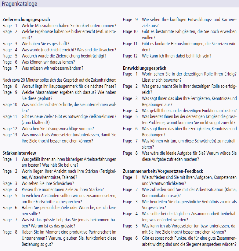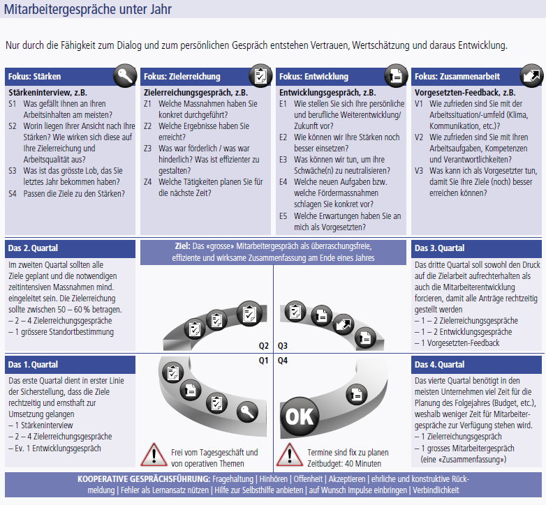 Wie jedes Jahr wurde versucht, den kurzfristigen und reaktiven Führungsmodus durch einen nachhaltigen zu ersetzen – trotz der kurzfristigen und optimistischen Vorgaben «von oben», der Dominanz der quantitativen Ziele, der fehlenden Zielvorstellungen der Mitarbeitenden usw. Auch Themen wie Karriereplan oder Feedback an den Vorgesetzten werden angesprochen, obschon alle wissen: Es sind wie schon in der Vergangenheit zu viele Themen für ein Gespräch.
