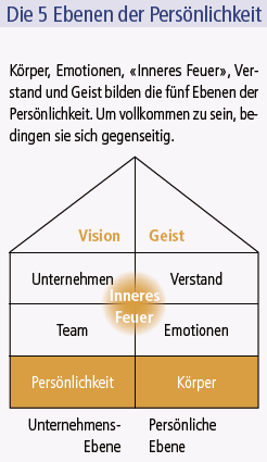 Die Persönlichkeit umfasst die folgenden fünf Ebenen: Körper, Emotionen, «Inneres Feuer», Verstand und Geist (spirituelle Ebene). Wie ein Haus nur komplett ist mit festem Fundament, Zwischengeschossen und Dach, so ist auch ein Mensch nur durch die Integration der fünf Ebenen vollkommen.