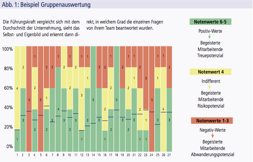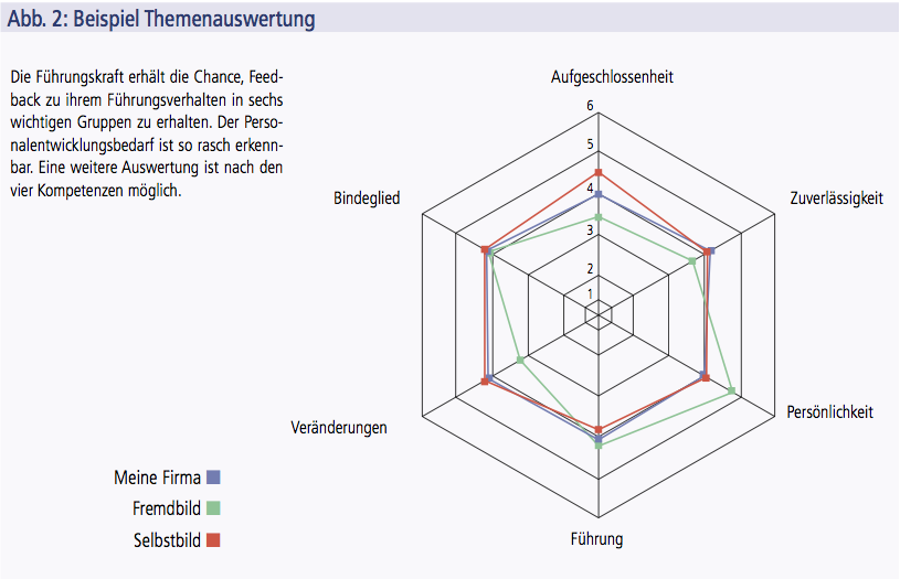 Transparente Abbildungen helfen, schnell auf den Punkt zu kommen. Die Steigerung der Führungsqualität soll zielorientiert und messbar sein. Die Abbildungen eins bis drei zeigen eine Auswahl der Charts aus dem Tool von HR-aktiv-Kompass, um gezielt mit der Führungskraft gemeinsam die Chancen zu erkennen.