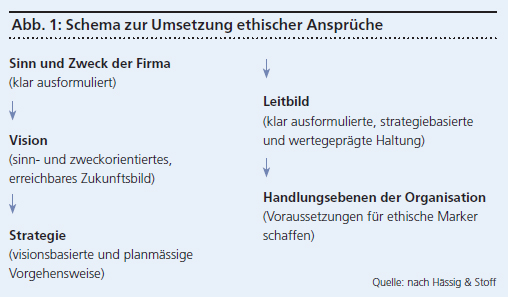 Es erstaunt, dass sich viele Firmen gar nicht bewusst sind, wie und in welcher Form sie ihr Selbstverständnis beschreiben. Um sich dessen bewusst zu werden und sich damit eine Grundlage für eigene ethische Ansprüche zu schaffen, bietet das Schema (siehe Abbildung 1) eine einfache Hilfestellung.