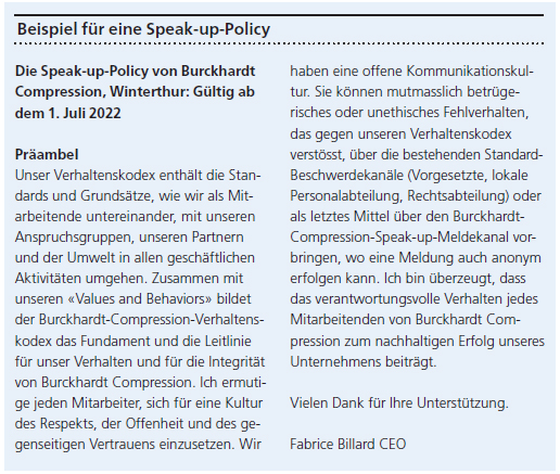 «Soll ich etwas sagen oder lieber den Mund halten?» Diese Frage stellen sich Arbeitnehmer immer wieder, wenn im Arbeitsalltag die Sicherheit durch falsches Verhalten von Kollegen, Kunden und das Unternehmen dadurch gefährdet ist. Warum ist es wichtig, seine Bedenken zu äussern, und wie kann man sich auf ein Speak up vorbereiten? Was hindert Mitarbeiter daran, Fehlverhalten und Missstände im Unternehmen zu melden? Verantwortliche sollten deshalb regelmässig darüber informieren, dass das Melden von Missständen in den Verantwortungsbereich jedes Mitarbeiters fällt – unabhängig von der Position. Veranstaltungen, Schulungen, Feedback-Gespräche und Team-Besprechungen sind hierfür gute Gelegenheiten. Entscheidend ist, dass Vorgesetzte mit gutem Beispiel vorangehen, ihre Mitarbeitenden immer wieder zu Speak up ermuntern und diese positiv entgegennehmen.Wenn ein Mitarbeiter den Mut fasst, einen Verdacht zu melden, kann es entmutigend sein, wenn er oder sie kein Feedback zum Ergebnis der Meldung erhält. Es ist deshalb sehr wichtig, dass Mitarbeiter das Gefühl haben, dass ihre Bedenken ernst genommen und untersucht werden und dass sie vom Unternehmen informiert werden, welche Konsequenzen sein Hinweis auf den Missstand hatte. Es bestehen nicht selten Unsicherheiten darüber, was wie gemeldet werden sollte und zu welchem Zeitpunkt. Deshalb ist von den Unternehmen eine Kultur zu fördern, in der auch einfache Bedenken vorgebracht werden können. So ist man eher auf der richtigen Seite, um Reputationsschäden zu vermeiden. Der Hinweis von der Firma Burckhardt Compression könnte als Anregung dienlich sein (siehe Box «Beispiel für eine Speak-up-Policy»).