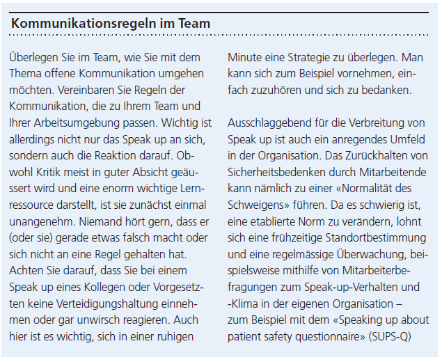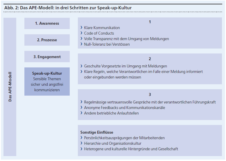 Eine Speak-up-Kultur liegt vor, wenn eine Organisation das Ansprechen von Bedenken und Fehlverhalten fördert, schätzt und schützt. Eine Speak-up-Kultur fusst vor allem auf vier Grössen: «Risiken eingehen, Fehler eingestehen, Fragen stellen, Probleme ansprechen».