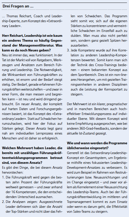 Ein Manager der zweiten Kategorie befindet sich sozusagen bereits auf diesem neutralen Level, denn er hat keine Schwächen, die er erst einmal beheben sollte und kann direkt loslegen, seine Stärken zu finden und auszubauen. Dass es bei Managern der dritten Kategorie direkte Ansatzpunkte gibt, sich zu einem «Extraordinary Leader» entwickeln zu können, liegt deutlich auf der Hand.