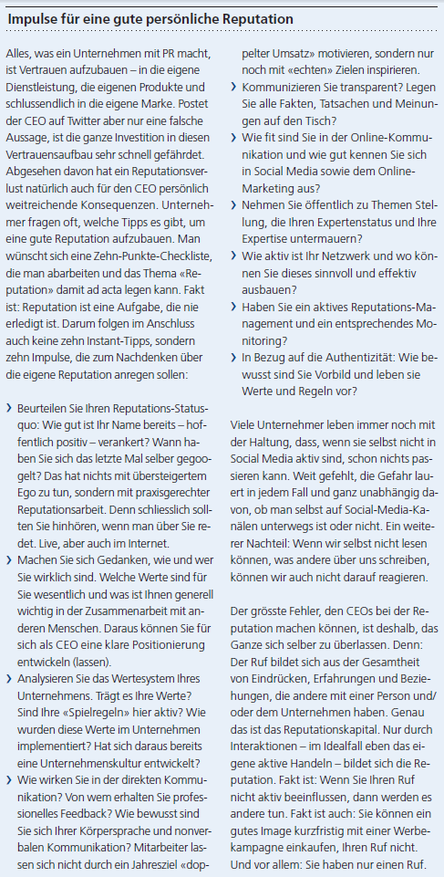 Diese Umstände bereiten vielen Unternehmen grosse Schwierigkeiten, weil sie ihre Kommunikation (intern und extern) komplett umstellen müssten. Und dafür gibt es keine Alternative. Kein Unternehmen kann es sich heute mehr leisten, erstens Reputationsmanagement nicht in die Unternehmensstrategie zu integrieren und zweitens, die Reputation des eigenen CEO nicht gezielt zu managen.