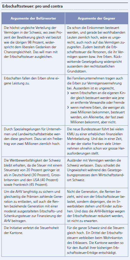 Die Erbschaftssteuer wird auf dem Nachlass von natürlichen Personen erhoben, die ihren Wohnsitz im Zeitpunkt des Todes in der Schweiz hatten oder bei denen der Erbgang in der Schweiz eröffnet worden ist. Die Schenkungssteuer wird beim Schenker erhoben. Der Steuersatz beträgt 20 Prozent. Nicht besteuert werden:
