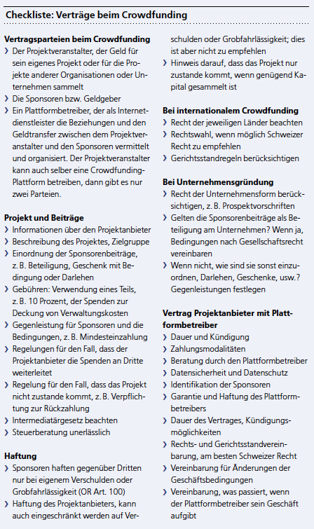 Ein Crowdfundig-Projektveranstalter, je nach Umständen auch der Plattformdienstleister, kann nach Geldwäschereigesetz (GwG Art. 2) unter bestimmten Bedingungen als Finanzintermediär gelten. Darunter versteht das Gesetz Personen, die berufsmässig fremde Vermögenswerte annehmen und dabei helfen, diese anzulegen oder zu übertragen, zum Beispiel Dienstleistungen für den Zahlungsverkehr erbringen und namentlich für Dritte elektronische Überweisungen vornehmen. Jedenfalls sollte man, sobald man das Crowdfunding gewerbsmässig betreibt, das Geldwäschereigesetz sowie die Verordnung über die berufsmässige Ausübung der Finanzintermediation (VBF) beachten. Nach dieser gilt man bereits als berufsmässiger Finanzintermediär, wenn man pro Kalenderjahr einen Bruttoerlös von mehr als 20 000 Franken erzielt und /oder mit mehr als 20 Vertragsparteien Geschäftsbeziehungen unterhält, die sich nicht auf eine einmalige Tätigkeit beschränken.