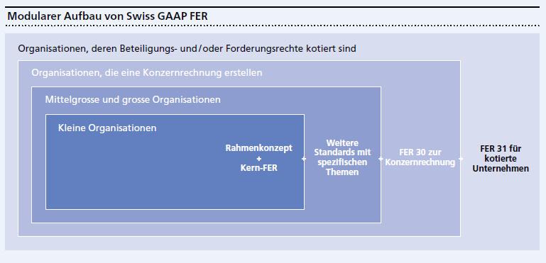 Viele der betroffenen Genossenschaften und Stiftungen sind national ausgerichtet. Daher erstaunt es nicht, dass die meisten Swiss GAAP FER einführen werden. Zudem ist die Anwendung von FER bei Nonprofit-Organisationen bereits heute weit verbreitet – auf freiwilliger Basis. Die hohe Akzeptanz dieses Standards begründet sich auch mit der Tatsache, dass mit FER 21 eine spezifische, auf gemeinnützige, soziale Nonprofit-Organisationen ausgerichtete Fachempfehlung besteht. Alle übrigen Organisationen sind weiterhin nicht verpflichtet, einen Abschluss nach dem Prinzip «true and fair view» zu erstellen. Allerdings können Minderheiten einen solchen verlangen. Dieses Recht steht qualifizierten Minderheiten zu, die mindestens 20 Prozent des Grundkapitals, 10 Prozent der Genossenschafter oder 20 Prozent der Vereinsmitglieder vertreten. Über dasselbe Recht verfügt jeder Gesellschafter und jedes Mitglied mit persönlicher Haftung oder Nachschusspflicht. Die Minderheitsrechte können unabhängig von der Grösse des Unternehmens geltend gemacht werden. Gerade für kleine Organisationen liegen die Vorteile von Swiss GAAP FER auf der Hand: Dank des modularen Aufbaus (Abbildung) müssen sie lediglich das Rahmenkonzept und sechs weitere, zentrale Fachempfehlungen anwenden. So lässt sich mit dem Einsatz weniger, prinzipienbasierter Fachempfehlungen ein aussagekräftiger Abschluss erstellen.