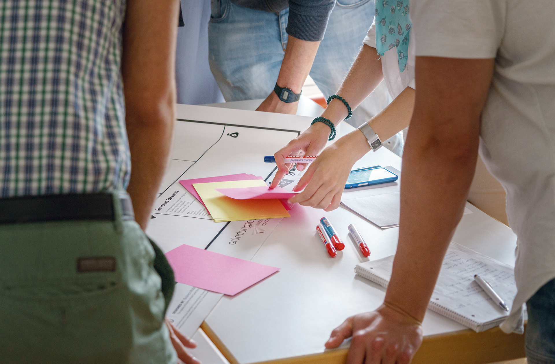 Ausserdem sollte der Workshop möglichst abgeschottet vom Büroalltag stattfinden. Keine Telefonate, keine Termine zwischendurch. Alle Teilnehmenden sollten dem Workshop ihre uneingeschränkte Aufmerksamkeit schenken. Neben einem geeigneten Raum werden ausserdem verschiedene Materialien benötigt: Flipcharts, verschiedenfarbige Stifte, Post-Its, Kleber, Knete, Lego usw., der Kreativität sind keine Grenzen gesetzt. Je nachdem, wie viele Personen an dem Workshop teilnehmen, ist es sinnvoll, diese in Gruppen aufzuteilen. Eine optimale Teamgrösse besteht aus fünf bis sechs Personen.