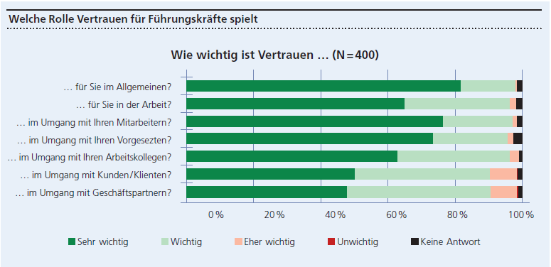 Im Einzelnen erwarten 70 Prozent der Befragten von einer Person, welche sie sympathisch finden, mehr Kooperation. Sympathie ist vor allem bei jüngeren Mitarbeitern unter 40 ein höchst wichtiger Faktor, während ältere Mitarbeiter hier ganz stark differenzieren. Über 60-jährige Mitarbeiter vertrauen nur noch zu 40 Prozent. Dies erweckt den Anschein, als ob sich Vertrauen manchmal über längere Frist aufbrauchen würde.