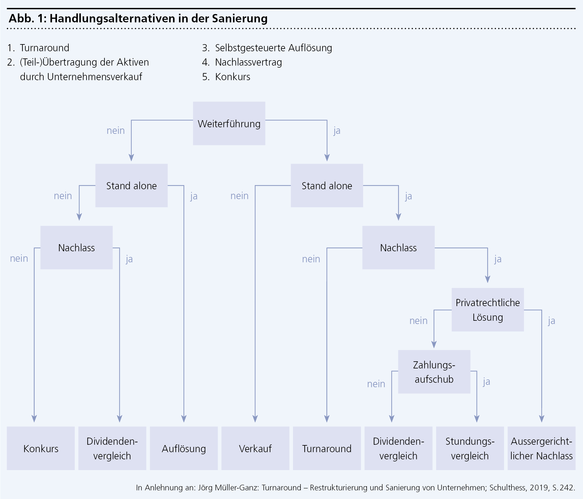 Hier beginnt das strategische Denken. In einer Unternehmenskrise gibt es sowohl für die betroffene Gesellschaft wie auch für die Beteiligten nur schlechte Optionen. Je länger zugewartet wird, desto mehr Türen gehen zu und es verbleiben zunehmend nur die Optionen, die einen noch grösseren Wertverlust mit sich bringen. Abbildung 1 zeigt eine Hierarchie und einen Entscheidungsbaum von Handlungsalternativen.