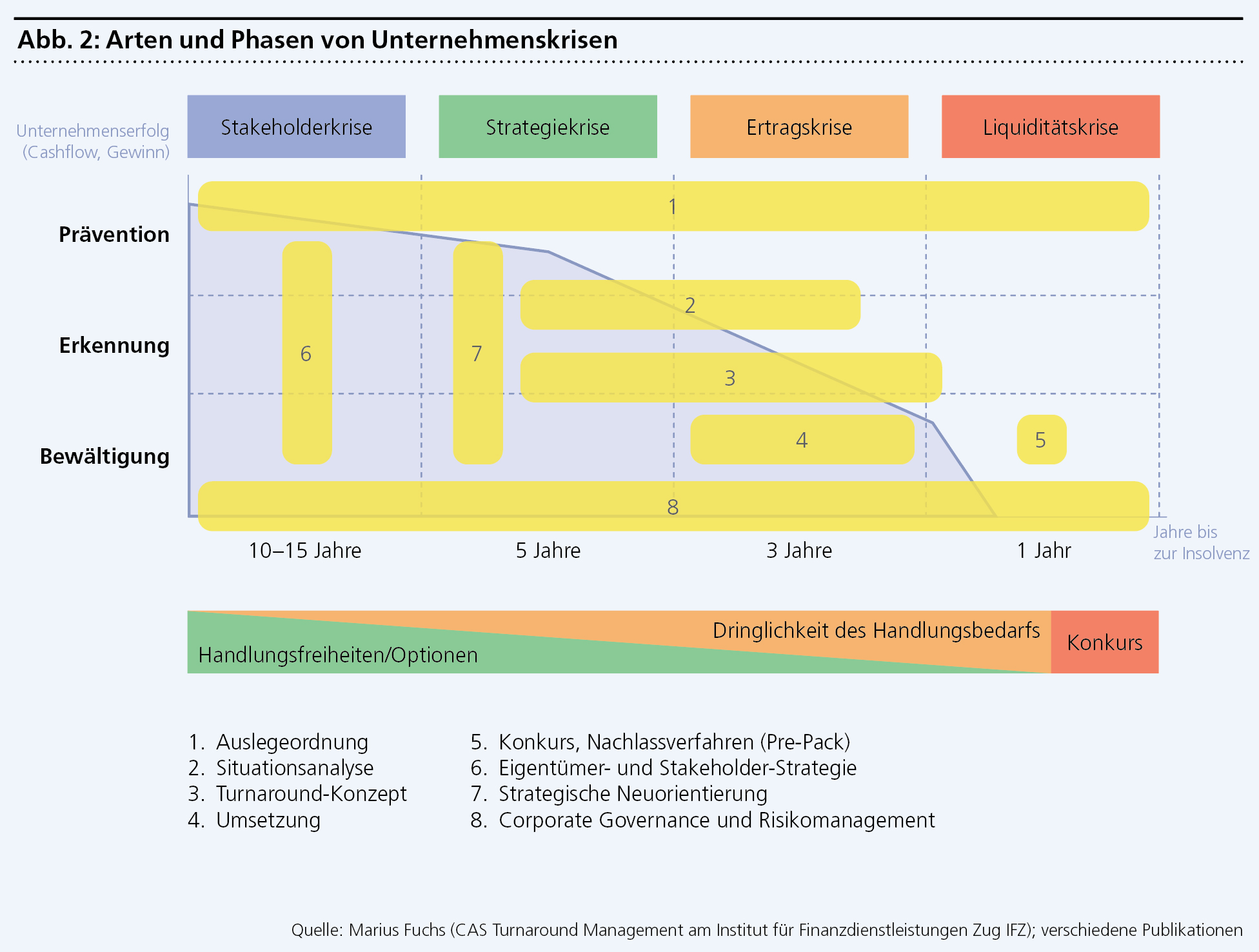 Ein schwelender Krisenverlauf oder eine Hängepartie verfügen über grosse Zerstörungskraft und können betroffene Unternehmen im Konkurs enden lassen. Es ist wie der bittersüsse Tod. Der nun offene Ausbruch der Krise ist schmerzhaft, kann aber wie ein langersehntes Gewitter wirken, das die endlos hängende Schwüle wegfegt. Nun werden gesetzliche (Soll-)Bruchstellen wie Zahlungsunfähigkeit und Überschuldung gemäss Art. 725 OR real. Fristen (sprichwörtliche «Deadlines») werden fassbar. Zögerliche und ausweichende Akteure werden zum Handeln gezwungen und die Parteien müssen sich zusammenraufen. Bei Gefahr der Zahlungsunfähigkeit ist der Verwaltungsrat für das Ergreifen von Massnahmen verantwortlich. Im Grundsatz wird bereits bei gelegentlichen Liquiditätsengpässen empfohlen, sich frühzeitig mit Banken und Lieferanten auszutauschen. Mit der nun eingetretenen Zahlungsunfähigkeit braucht es umfassendere Massnahmen. Der Verwaltungsrat ist nun gefordert und die Lösungssuche nimmt Fahrt auf.