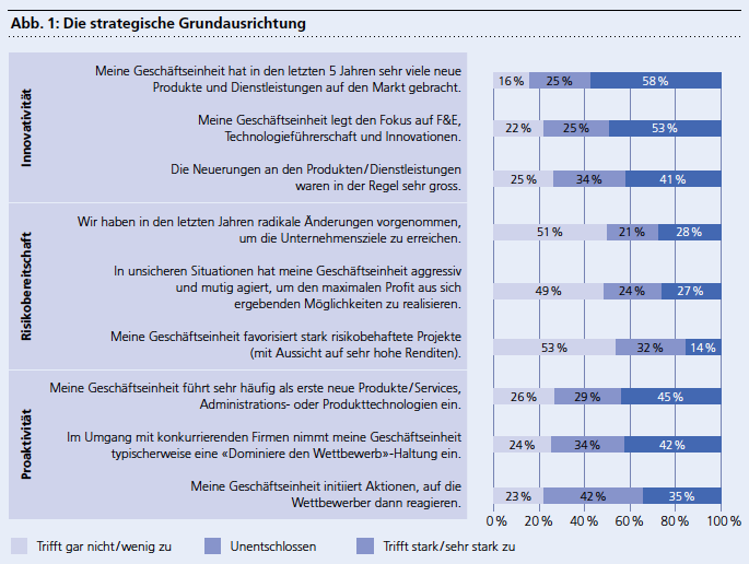 Die strategische Grundausrichtung der Unternehmen wurde anhand dreier Dimensionen ermittelt: Innovationsorientierung, Risikofreudigkeit und Proaktivität. Diese Faktoren gelten als wichtige Indikatoren zur Beurteilung der Innovationskraft von Unternehmen, und folglich kann erwartet werden, dass sie auch die Lieferantenauswahl beeinflussen. 56 Prozent der Teilnehmer gaben an, dass ihr Unternehmen eher oder stark innovationsorientiert ist. Für lediglich 19 Prozent der Unternehmen sind Innovationen von nachrangiger Bedeutung.