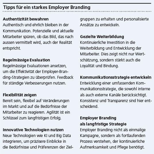 Stattdessen sollte man sich von Marktbeobachtungen inspirieren lassen und daraus ein individuelles Employer Branding entwickeln. Der Fachkräftemangel lässt sich zwar nicht beseitigen, aber durch eine gezielte Positionierung des Unternehmens auf dem Arbeitsmarkt kann der Recruitingerfolg trotz der bekannten Engpässe auf eine solide Basis gestellt werden.