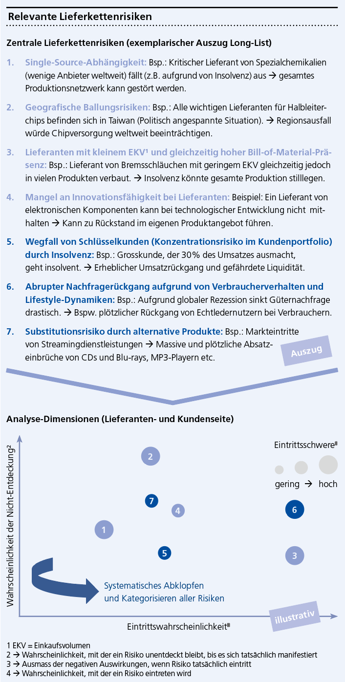 Ein Beispiel zeigt, wie entscheidend diese erste Phase ist: Ein mittelständisches Unternehmen, das stark von einem einzelnen Lieferanten für spezielle Elektronikkomponenten abhängig ist, könnte durch eine frühzeitige Analyse und die Identifikation dieser Abhängigkeit seine Lieferantenbasis rechtzeitig diversifizieren. Das Unternehmen würde so einer möglichen Produktionsunterbrechung entgehen, die durch eine Insolvenz dieses Lieferanten ausgelöst würde. Dabei werden Faktoren wie die Abhängigkeit von essenziellen Rohstoffen oder Komponenten berücksichtigt, die oft schwer oder nur mit grossem Aufwand ersetzt werden können. Durch die Identifikation und das Verständnis der Ersetzbarkeit einzelner Lieferanten können im Nachgang zum Beispiel alternative Lieferanten frühzeitig qualifiziert werden, was die Versorgungssicherheit nachhaltig stärkt.
