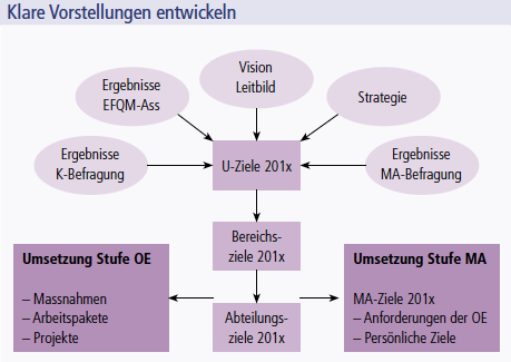 Damit der Erfolg überprüft und gesteuert werden kann, müssen zunächst aussagekräftige Indikatoren bestimmt werden. Für unsere Reise können dies Ortschaften, Zeiten, Kosten und die Zufriedenheit der Mitreisenden sein. Die Relevanz der Messgrössen wird regelmässig überprüft. Indikatoren, die keinen Handlungsbedarf anzeigen, werden durch aussagekräftigere ersetzt. In der Planung werden die Ziele in eine Abhängigkeit zueinander gebracht. Sie kann auch als Ursache-/Wirkungsprinzip bezeichnet werden. In Unternehmen kommt hierfür oft eine Balanced Scorecard (BSC) zum Einsatz. Dieses Vorgehen hilft dem Management, die Zusammenhänge und Abhängigkeiten in der Organisation besser zu verstehen und Indikatoren zu definieren, die frühzeitig allfälligen Handlungsbedarf anzeigen. Die Messergebnisse werden erhoben, zentral festgehalten und stufengerecht ausgewertet. Zeigen die Ergebnisse Handlungsbedarf an, werden Korrekturmassnahmen eingeleitet.
