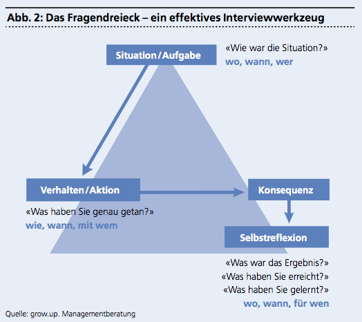 Man sagt, dass Menschen aufgrund ihrer fachlichen Kompetenzen eingestellt und aufgrund ihrer persönlichen Merkmale wieder entlassen werden. Mit dem Fragendreieck gelingt es, neben Kompetenzen auch Motive des Bewerbers zu erfassen, also zu klären, warum er sich in einer bestimmten Situation so verhalten hat und nicht anders. Auf diese Weise wird deutlich, was dem Bewerber wichtig ist, ohne ihn direkt zu fragen. Dabei liefert vergangenes Verhalten eine gute Vorhersage für zukünftiges Verhalten. Hat ein Bewerber in der Vergangenheit schon einmal bewiesen, dass er konfliktfähig ist, wird er dies mit grosser Wahrscheinlichkeit erneut sein.