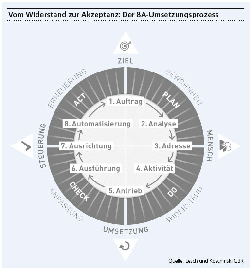 Entscheidend sind die Faktoren Changemanagement und Akzeptanzmanagement. Beide Prozesse sind Chefsache. Geschäftsleitung und Management stehen in der Verantwortung, Akzeptanzbarrieren zu identifizieren und zu beseitigen – durch Massnahmen, die bei denjenigen, die die Changekonzepte letztlich umsetzen sollen, also den Mitarbeitern, eine entsprechende Motivation und Akzeptanz schaffen. Darum stehen Change- und Akzeptanzmanagement immer in einem Zusammenhang mit praktischen Umsetzungsmassnahmen. So erleben die Beteiligten in Umsetzungsprojekten hautnah, welche Konsequenzen eine Veränderung für sie selbst, ihren Arbeitsplatz, ihr Team, ihre Abteilung und ihren Unternehmensbereich hat. Die Mitarbeiter haben ein Recht darauf, zu erfahren, was der Change für sie persönlich bedeutet.