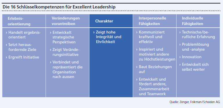 Die Frage, was nun die aussergewöhnlichen Führungskräfte von anderen Führungskräften unterscheidet, ist in diesem Zusammenhang naheliegend: Welche Kompetenzen haben diese hervorragenden Führungskräfte? Worauf gründen ihre exzellenten Führungsqualitäten? Zenger und Folkman identifizieren 16 Kompetenzen, die bei herausragenden Chefs überdurchschnittlich häufig vorzufinden sind. Diese Kompetenzen lassen sich in fünf Bereiche unterteilen: Ergebnisorientierung, Veränderungen vorantreiben, Charakter, interpersonelle Fähigkeiten, individuelle Fähigkeiten (siehe Box Seite 21).