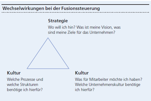 Jedes Unternehmen hat seine eigene Geschichte und Kultur. Fusionieren zwei Unternehmen, entbrennt meist ein Kampf um das neue Leitbild. Diesen gewinnt, sofern dieser Prozess nicht gesteuert wird, in der Regel das übernehmende Unternehmen, selbst wenn offiziell eine «Hochzeit unter gleichen» verkündet wird. Der «Übernehmer» dominiert also das übernommene Unternehmen. Dasselbe gilt, wenn zwei Niederlassungen von Unternehmen oder Unternehmensbereichen wie zum Beispiel der Service und der Vertrieb fusionieren. Das verstärkt die Ressentiments der Mitarbeiter, was zu unnötigen Widerständen führt. Deshalb empfiehlt es sich, bei Fusionen eine Analyse durchzuführen, welche Elemente in den Kulturen der beiden Unternehmen die Zielerreichung fördern und deshalb in die neue Kultur einfliessen sollten.