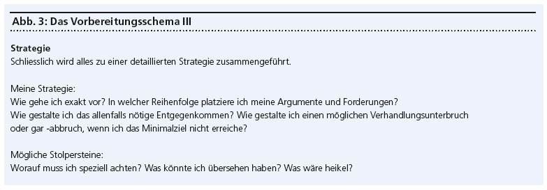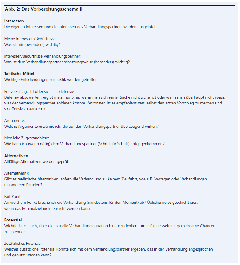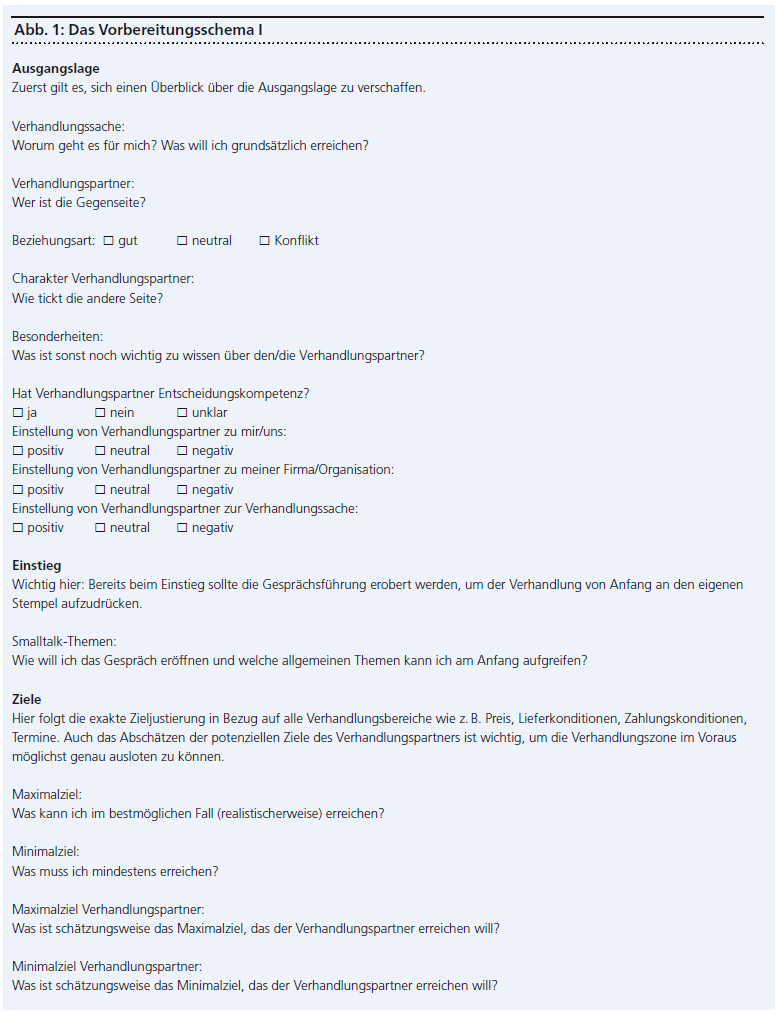 Dabei hilft das folgende Vorbereitungsschema (siehe Abbildungen). Dieses muss logischerweise nicht bei jeder nebensächlichen Verhandlung von A bis Z durchgegangen werden. Aber bei wichtigen Verhandlungen empfiehlt sich eine möglichst detaillierte Vorbereitung anhand dieses Schemas. Einige wichtige Aspekte aus diesem Vorbereitungsschema werden in der Folge speziell herausgehoben und erläutert.