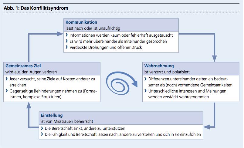 Nur wenn diese Erkenntnis vorhanden ist, kann situationsgerecht interveniert werden. Das Konfliktsyndrom ist schematisch in der Abbildung 1 dargestellt. Sensibilisierte Personen können dann schnell aufgrund der Beobachtungen in der Kommunikation, bei der Wahrnehmung und der Einstellung Defizite lokalisieren.