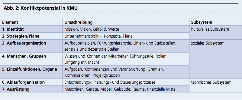 Bei Untersuchungen von vielen Organisationen zeigt sich immer wieder, dass das Konfliktpotenzial und damit die Konfliktursachen gut strukturiert werden können, obwohl Aufgaben, Grösse oder Rechtsform der Organisationen völlig verschieden sind. In Abbildung 2 sind die sieben wichtigsten Konfliktursachen zusammengefasst. Der erste Punkt der Identität hat in verschiedenen Unternehmen einen ganz unterschiedlichen Stellenwert. Bei Familienunternehmen ist dieser Punkt oft unkritisch, weil die Identität durch die Familiengeschichte determiniert ist.