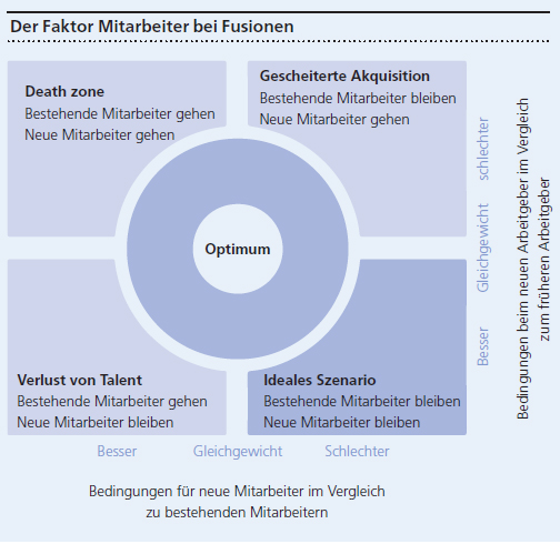 Im Zusammenhang mit einer Fusion oder Übernahme kommt eine weitere Dimension hinzu. Die Bedeutung dieser Laufbahn-Angebote rückt in den Fokus, weil jeder neue Mitarbeitende die Bedingungen beim neuen mit denen beim alten Arbeitgeber vergleichen wird, was für seine künftige Einstellung ausschlaggebend sein kann. Die Mitarbeitenden des fusionierten Unternehmens werden die Bedingungen der bisherigen Mitarbeitenden mit denen der neuen vergleichen und umgekehrt. Daraus ergibt sich eine schwierige, aber wichtige Optimierungsaufgabe.