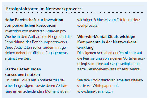 Um als Unternehmer nachhaltig erfolgreich zu sein, braucht es nebst vollem Einsatz im und für das Unternehmen auch eine Investition von mehreren Stunden pro Woche in den Aufbau, die Pflege und die Entwicklung des Beziehungsnetzwerks. Um Wirkung in seinem Umfeld zu erzielen, ist es unabdingbar, seine eigene Bekanntheit als Unternehmer zu steigern. Netzwerken ist mit einer grossen persönlichen Investition in Form von zeitlichen Ressourcen verbunden. Regelmässige, persönliche Präsenz an verschiedensten Anlässen ist entscheidend. Ben ist zwar auch oft an Messen oder Apéros anzutreffen. Er sieht darin aber eher das Vergnügen als die Arbeit.