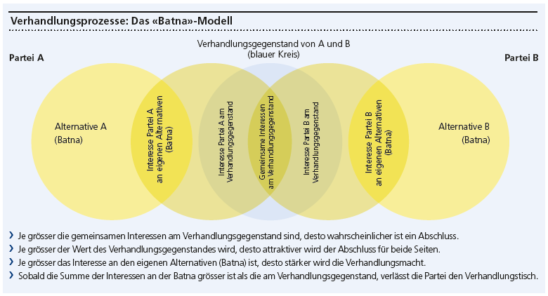 Alternativen müssen entwickelt werden, sie liegen in der Regel nicht im Detail ausgearbeitet auf der Strasse. Eine solide, auch wirklich realisierbare Alternative ist mehr als nur eine Fallback-Strategie. Sie liefert neue Sichtweisen, Optionen und Chancen, die einen wesentlichen Einfluss auf die Verhandlungen haben können. Beim Erforschen der Interessen geht es nicht darum, das Offensichtliche aufzulisten, sondern die tiefer liegenden Motivationen und Interessen zu verstehen, also, wieso man etwas möchte.