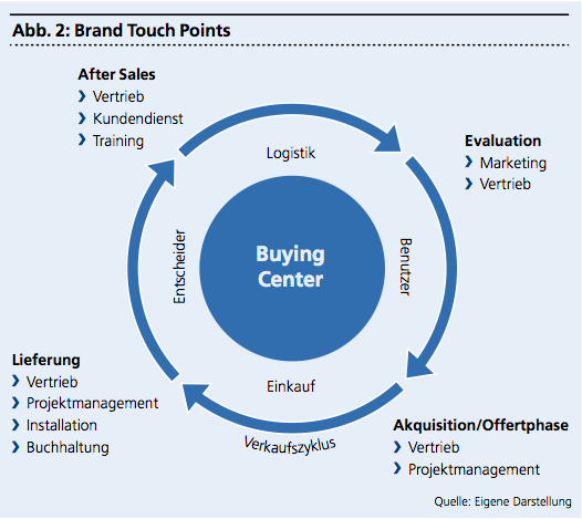 Ausgangspunkt aller Aktivitäten ist eine Situationsanalyse, die den Stellenwert der eigenen Marke aufzeigt. Zentral ist dabei die Frage, in welcher Erscheinungsform die relevanten Zielgruppen die Marke erleben und wo sie mit dieser in Berührung kommen, also die sogenannten Customer oder Brand Touch Points. Das ist auch der Ausgangspunkt für die Operationalisierung: Welche Rollen des Unternehmens (Vertrieb, Marketing, Projektmanagement, Debitorenbuchhaltung, Kundenservice usw.) sind wann im Verkaufszyklus (als Vorschlag: Evaluation, Akquisition, Lieferung, After Sales) mit welchen Rollen des Buying Centers des Kunden (Benutzer, Einkauf, Logistik, Entscheider usw.) in Kontakt. Der konkrete Rahmen muss an die individuellen Gegebenheiten einer Firma angepasst werden.
