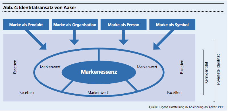 Einen ergänzenden Ansatz für die Operationalisierung der Markenidentität hat der ehemalige Berkeley-Professor Aaker gewählt. Er befürwortet sogenannte interne Leitbilder, wozu er Geschichten («Storytelling»), Programme, Ereignisse oder Menschen zählt, welche die Markenidentität perfekt repräsentieren. Eine starke Rolle spielt dabei der CEO, der mit einer klaren Vision die Marke vertritt und sie damit letzten Endes personifiziert. Die Markenidentität setzt sich demzufolge aus einer Kernidentität und einer erweiterten Markenidentität zusammen. Die Eigenschaften der Marke werden dem Produkt und der markenführenden Organisation zugeordnet. Die Marke hat des Weiteren menschliche Eigenschaften und tritt als starkes Symbol auf, was die Abbildung 4 zeigt.