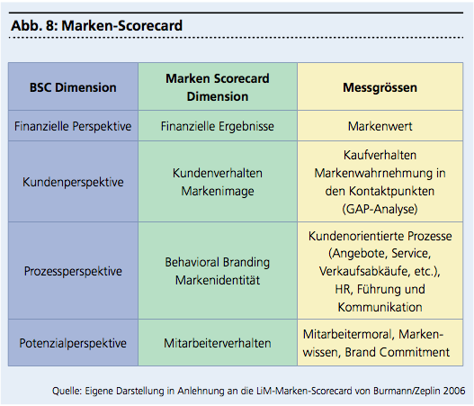 Eine Umsetzung in strategisches und operatives Controlling erscheint wenig zweckmässig. Hingegen sollen ökonomische und psychografische Grössen ein-fliessen. So wird auf die Grundidee des Balanced-Scorecard-Ansatzes zurückgegriffen (Abbildung 8). Mit der Balanced Scorecard wird ein sehr umfassender und integrativer Ansatz für die Beurteilung und Bewertung der internen und externen Faktoren gewählt, welche die Unternehmensprozesse beeinflussen. Ausserdem ist die Marke einer der zentralen Erfolgsfaktoren im gesamten unternehmerischen Wertschöpfungsprozess.