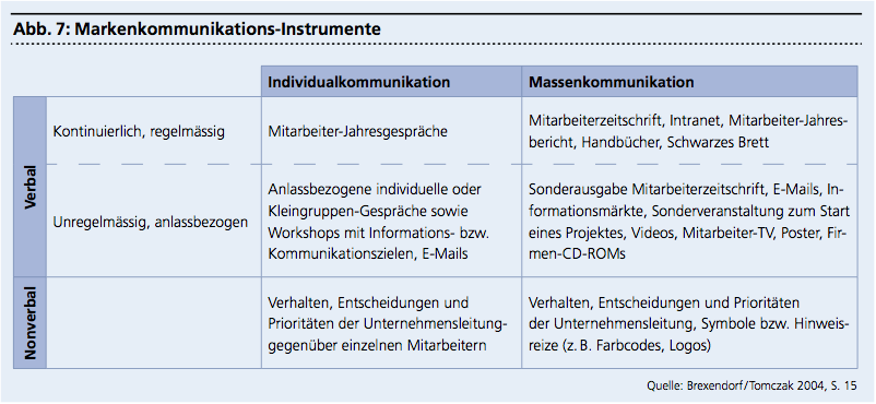 Mitarbeiterinnen und Mitarbeiter müssen regelmässig und kontinuierlich direkt oder indirekt an die Markenwerte erinnert werden. Deshalb wird der Kommunikation grosse Aufmerksamkeit geschenkt. Es ist zentral, dass die Mitarbeitenden den Zusammenhang zwischen ihrer Tätigkeit und dem Markenimage kennen. In der Markenkommunikation können verschiedene Typen von Instrumenten unterschieden werden. Dabei ist klar, dass externe Markenkommunikation auch intern Wirkung ausübt und umgekehrt. Die verwendeten Instrumente sind nicht neu und werden teilweise ohnehin in der Marketing-Kommunikation verwendet (Abbildung 7).