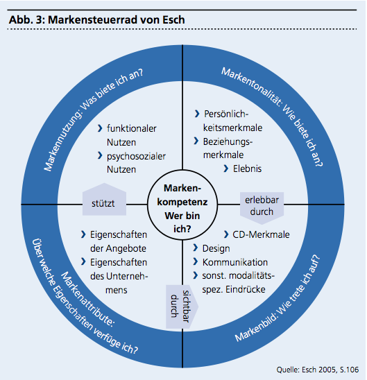 Der Kontext-Faktor Kultur-Fit spielt ebenfalls eine besondere Rolle. Das gemeinsame Markenverständnis ist eine Voraussetzung dafür, dass die Markenidentität den Kunden konsistent vermittelt werden kann. In der Regel gibt es drei Markenwerte, welche die Markenfunktion, den emotionalen sowie den beschreibenden Charakter der Marken kennzeichnen. Dazu kann beispielsweise das Markensteuerrad des deutschen Marketing- und Werbeexperten Esch beigezogen werden (Abbildung 3). Es hilft bei der konkreten Formulierung von Handlungsweisen oder Zielvorgaben.