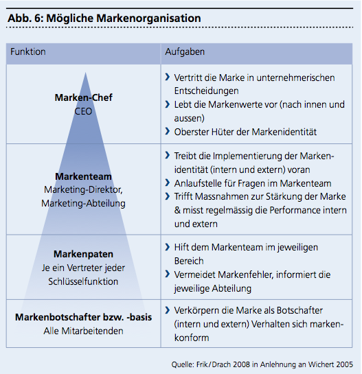 Weiter ist das Personalmanagement dafür verantwortlich, durch Massnahmen der Integration neuer Mitarbeiter und der Personalentwicklung die Internalisierung der Markenidentität zu unterstützen. Unter diesem Aspekt ist es interessant zu sehen, dass eine Schweizer Grossbank ein Konzernleitungsmitglied hat, das gleichzeitig für das Personalwesen, die Firmenkommunikation und die Markenführung verantwortlich zeichnet.