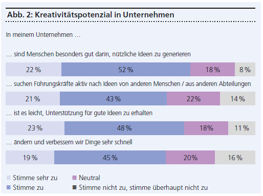 Um kreative Prozesse gezielt fördern zu können, hat Dale Carnegie Training mehr als 5000 Mitarbeiter in 16 Ländern zum Thema befragt. Das Ziel der Studie (Dale Carnegie Training: Kreativität – ein sozialer Prozess. Die zwischenmenschliche Dynamik von Innovation am Arbeitsplatz. White Paper. 2021): besser verstehen, was Kreativität beeinflusst und wie gut es Organisationen gelingt, ein innovativ-freundliches Umfeld zu schaffen. Der Status quo offenbart Luft nach oben. Vielen Unternehmen fehlt es an Routine, frische Ideen aufzuspüren und auszuarbeiten. Zwar stimmten fast drei Viertel der Teilnehmer zu, dass Kollegen nützliche Vorschläge machen. Deutlich weniger bestätigten jedoch, dass Führungskräfte neue Einfälle aktiv einfordern.