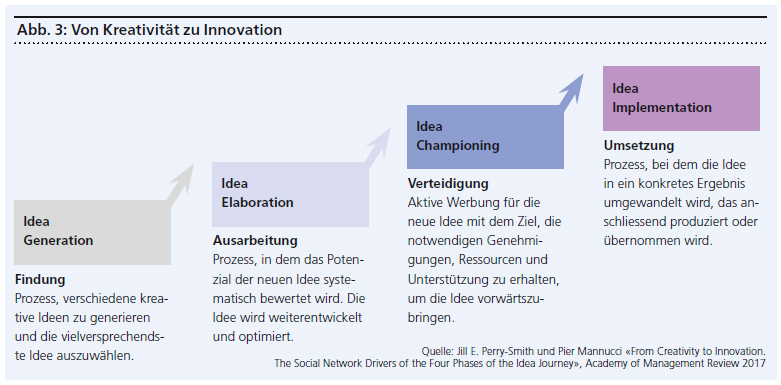 Kurz gesagt: Viele gute Gedanken bleiben in der Geschäftswelt Theorie. Fast drei von zehn Befragten erklärten, dass es nicht einfach sei, Unterstützung für Ideen zu erhalten. Gleichzeitig bekunden die meisten, dass ihr Betrieb mehr beitragen könnte, um kreative Anregungen zu fördern. Dass der Skill an Bedeutung im Arbeitsleben gewinnt und die Akteure dort schöpferisch veranlagt sind, scheint unbestreitbar: 82 Prozent der Stimmen bestätigten, dass in ihrem Team kreative Köpfe arbeiten. Doch ein Entwicklungsteam braucht mehr als mutige Talente, um zu funktionieren. Ob ein Hirngespinst zum Produkt reift, hängt vom Umfeld ab. Einen Gedanken in eine Innovation zu verwandeln, braucht vor allem eins: Sozialkompetenz und ein festes Prozedere.