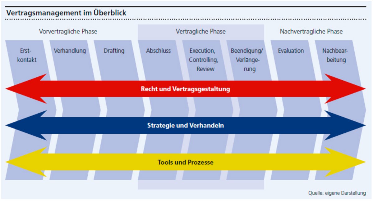 So beginnt Vertragsmanagement schon vor der Entstehung des Vertrags, beschlägt dessen gesamten Lebenszyklus und überdauert ihn nach dem Erlöschen. Über seine Lebensdauer hinweg wird der Vertrag zum Gegenstand verschiedener Tätigkeiten: Zum Beispiel wird er verhandelt, meistens verschriftlicht, unterzeichnet und abgelegt. Später müssen bisweilen vertragliche Ansprüche durchgesetzt werden, vielleicht muss er nachverhandelt werden oder man sollte ihn rechtzeitig kündigen.