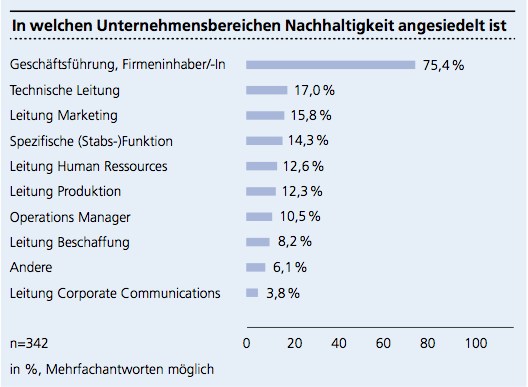 Entgegen der erwähnten starken Kundenorientierung stehen die Mitarbeiter als relevante Anspruchsgruppen (Stakeholder) an erster Stelle, gefolgt von den Lieferanten. Die Interaktion dieser Stakeholder in Zusammenhang mit der Umsetzung von Nachhaltigkeitsthemen ist noch wenig etabliert. Auch Netzwerkaktivitäten sind wenig ausgeprägt. Nach Meinung von Experten ist die dort festgestellte Zurückhaltung insbesondere bei KMU auf die begrenzten zeitlichen und finanziellen Ressourcen zurückzuführen.