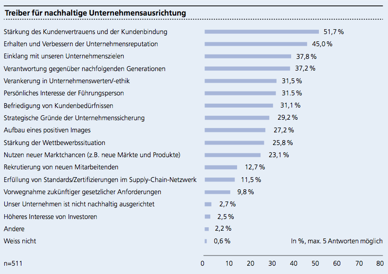 Langfristige und gesellschaftliche Motive wie die Verantwortung gegenüber nachfolgenden Generationen oder Gründe der Unternehmenssicherung folgen erst auf unteren Rängen. Auch die Antwortkategorie «Andere» beinhaltet keine offen genannten Beweggründe, die in Zusammenhang mit langfristigen globalen Herausforderungen wie zum Beispiel Klimawandel oder Energiekrisen stehen. Die Schweizer Unternehmen sind mit diesen Antworten nicht alleine. Aus der Studie von Accenture (2012), an der 766 CEOs aus 100 Ländern teilgenommen haben, geht hervor, dass 72 Prozent «Brand, trust and reputation» als Treiber für Nachhaltigkeitsaktivitäten nennen. Es ist an der Zeit, den Gedanken abzulegen, dass «grün» schlecht für das Geschäft ist.