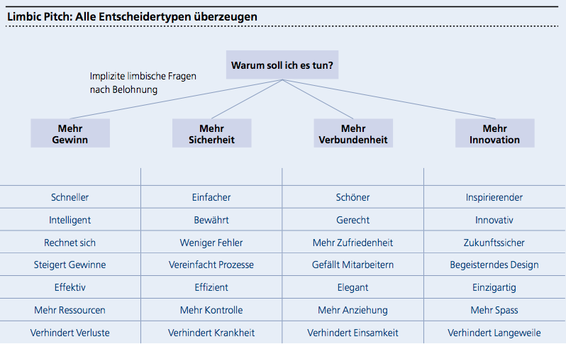 Mit der Limbic Pitch haben Sie eines der schnellsten und effektivsten Überzeugungsmittel, die Sie im Nu vorbereiten und mit der Sie sicher treffen. Damit sind Sie den meisten Kollegen und Mitbewerbern voraus und können jederzeit und ad hoc Ihre Idee durchsetzen und ihr Ziel erreichen. Die Limbic Pitch empfinden alle Entscheider als ausserordentlich überzeugend, denn sie spricht automatisch ihren Wert an und nennt noch weiteren limbischen Zusatznutzen. Dadurch werten wir unsere Argumentation auf und laden sie mit limbischer Begehrlichkeit auf: mit der Aussicht auf viel Belohnung, mit Aussicht auf viel von dem, was Ihrem Gegenüber wichtig und wertvoll ist. «